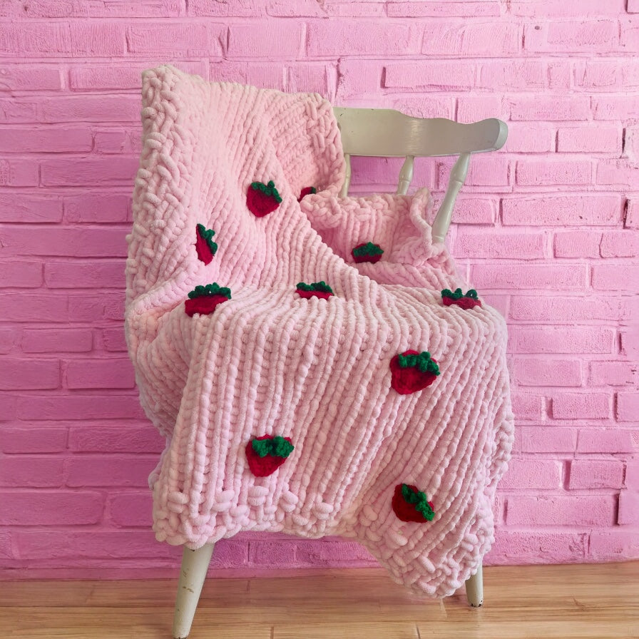 1 x Chenille Toddler Blanket (70x90cm) with hand-crocheted strawberry appliques